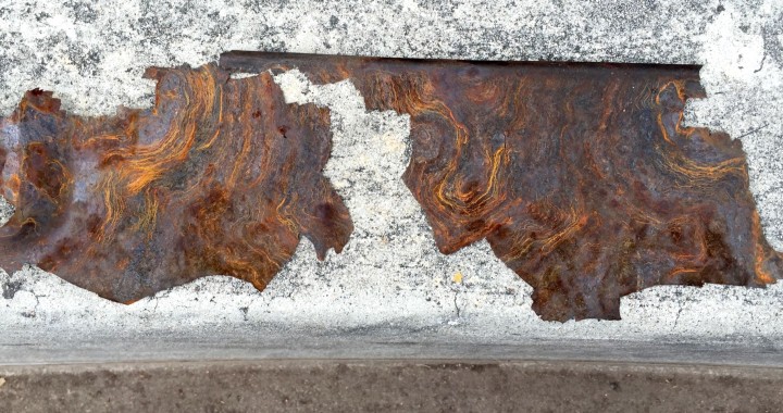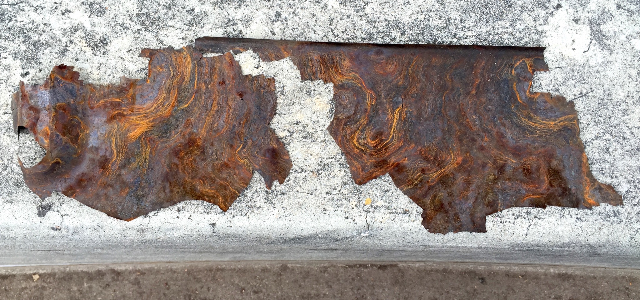 sometimes you can find beauty in the art of time. in this case, the front licence plate holder mount plate thing that has seen a quarter of a million miles has gathered some serious rust. the paint completely peeled off and surface rust has taken over. before i primed it to repaint it black, i stopped and took a moment to photograph the beauty time has blessed it with. paint had pealed off in major chunks, so i laid it on the curb. the patterns were quite something.